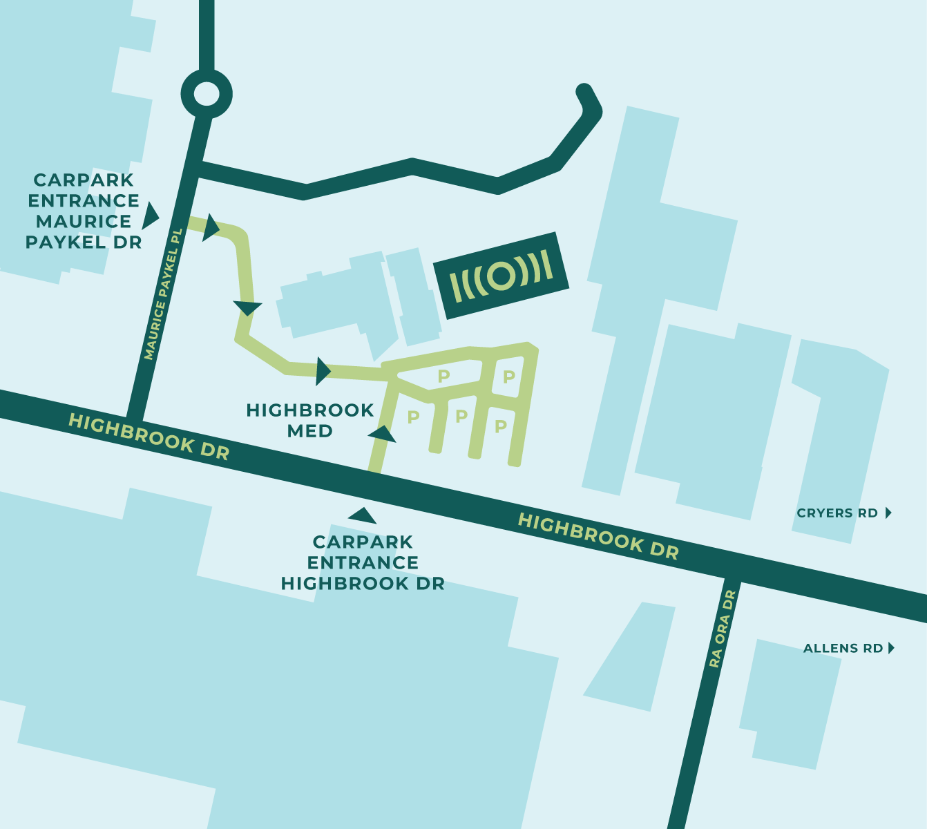 Enter via carpark entrance on Maurice Paykel Drive or 31 Highbrook Drive